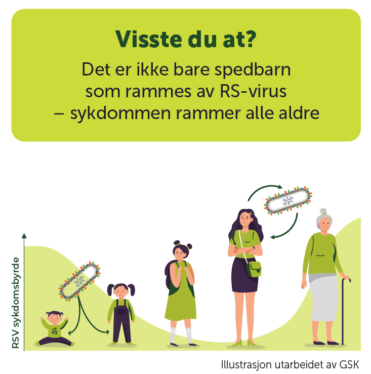 Respiratorisk syncytialvirus (RS-virus) er et vanlig virus som kan føre til luftveisinfeksjoner. RS-virus gir vanligvis forkjølelseslignende symptomer, og de fleste blir friske i løpet av en uke eller to.3 RS-virus rammer alle aldre, ikke bare spedbarn. Særlig eldre voksne kan være mer utsatt for alvorlig forløp med RS-virus, som kan føre til sykehusinnleggelse.1
